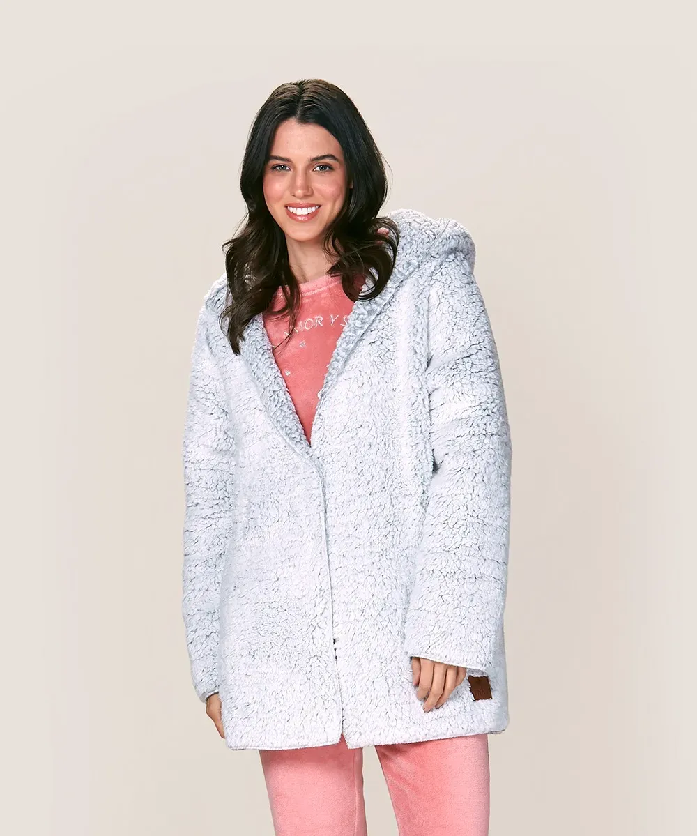 Abrígate con nuestra bata tipo corderito. Suave, abrigada y ultra cómoda. Cuenta con cierre frontal, bolsillos laterales y capucha para mayor calidez. Perfecta para el frío, sin perder el toque moderno y acogedor que tanto te gusta.