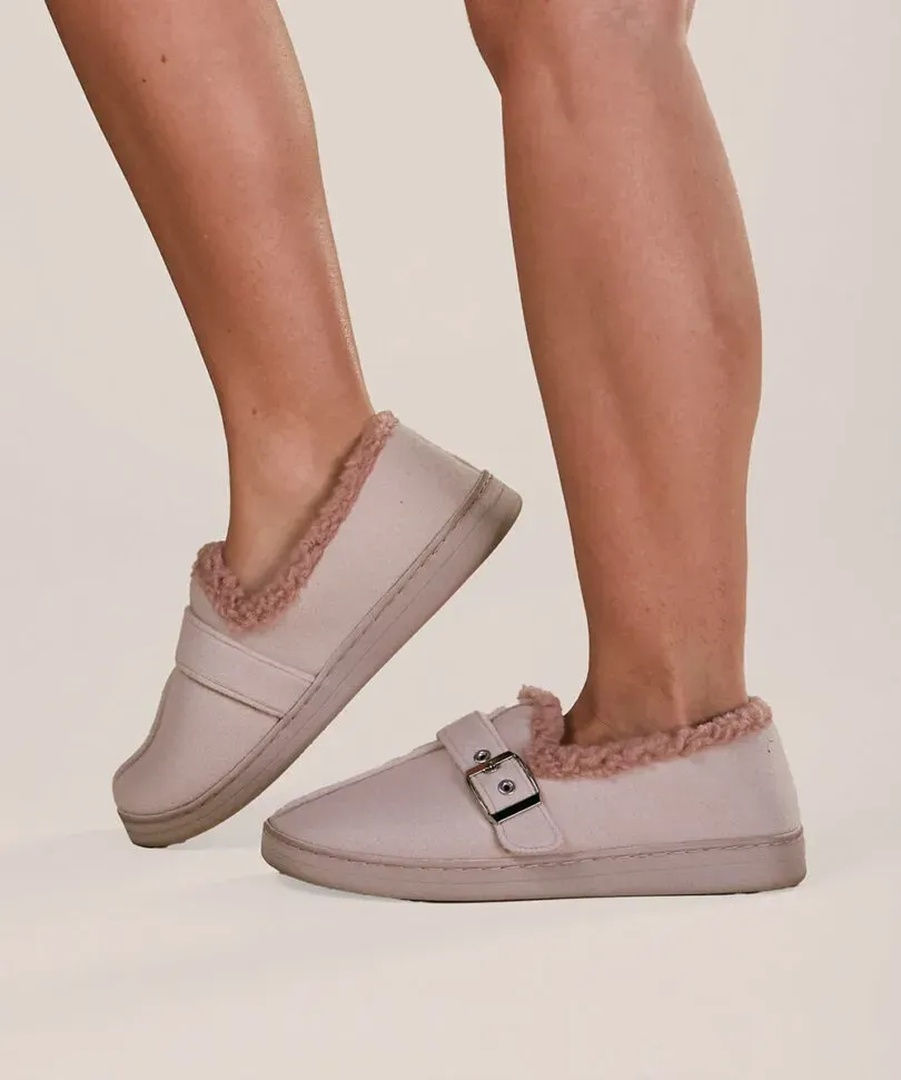 Pantuflas de diseño elegante con evilla decorativa, forrado interno con chiporro. Ideales para aquellos que buscan cubrir completamente su pie este invierno.
